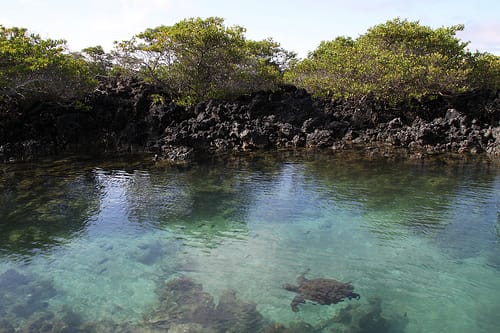La laguna que se encuentra en esta bahía es un sitio de descanso para tortugas marinas. Alrededor de la laguna crecen principalmente manglares rojos y blancos los cuales han alcanzado una altura impresionante. Este sitio es propicio para la observación de pingüinos. Horario de visita: De lunes a domingo de 6h00 a 18h00. (Sito de visita de la Reserva Marina de Galápagos).