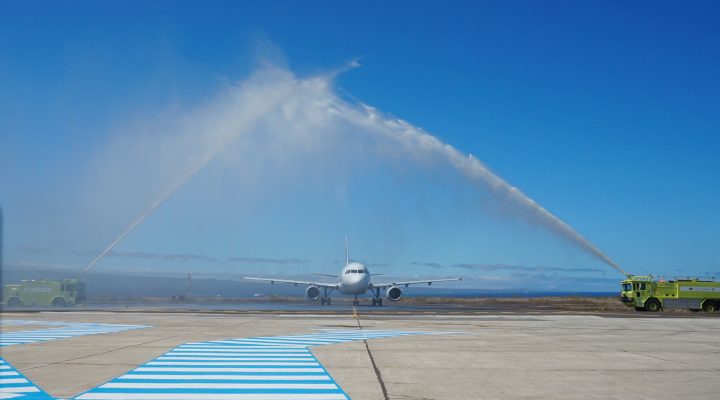 El avión de LATAM cruza el arco de agua reciclada en su arribo al Aeropuerto Ecológico de Galápagos. A las