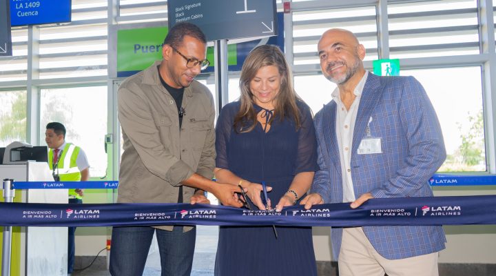 Byron Franco, viceministro de Transporte, Mónica Fistrovic, CEO Latam Ecuador y Jorge Rosillo, Gerente de ECOGAL, en el corte de